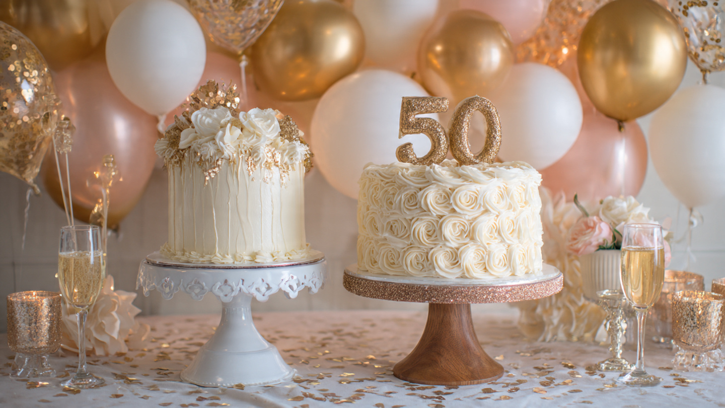 - 50th & Beyond: Elegant cakes in gold, silver, or muted tones with tasteful decorations.